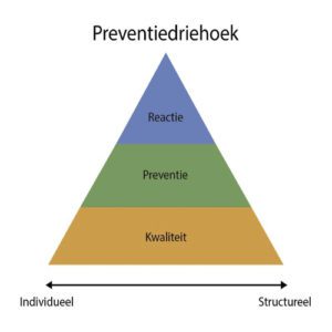 The “Prevention Triangle” can be a helpful visualisation. As an organisation, the priority is your “quality governance”. This means that you create an environment where people feel seen, where they dare to speak up when problems arise, where they feel part of the work and motivated, etc.